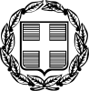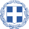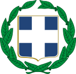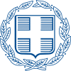 The current emblem is defined by Law 48/1975.[18] The blue shield with the white cross was restored, and the proportions of the escutcheon specified as 1&fras1;8 longer than its width.[18] The shield is surrounded entirely by two branches of laurel;[18] their colour is not specified but in practice they are almost universally shown as monochromatic. The coat of arms was designed in 1974 by Greek artist Kostas Grammatopoulos.[19] The government uses a stylised version of the coat of arms as a government logo.[20] The design was implemented beginning in 2010 as a means of standardising the branding of the various Greek government ministries.[20] It specified the design and colour of the national emblem when used as a logo, and designated FF Meta as the official typeface for use across all media to represent the Government of Greece.[20] Instead of showing the blue parts of the shield as solid colour, the government logo utilises heraldic hatching, with horizontal lines signifying azure (blue).