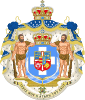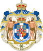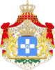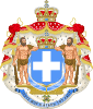 Following Otto's deposition in 1862, the 17-year old Prince William of Denmark was chosen in 1863 as Greece's new king. The coat of arms was suitably altered by the Royal Decree of 9 November 1863.[15] The text of the decree was almost identical to that of 1833, with minor additions and removals to accommodate Greece's new royal house, the House of Glücksburg.[15] The escutcheon remained the same, but the dynastic arms of the Glücksburg family, including the three lions of the arms of Denmark proper, the two lions of Schleswig, the nettle leaf of Holstein, the horse head of Lauenburg, the two red bars of the House of Oldenburg and the yellow cross of Delmenhorst, were added in the centre of the cross when the coat of arms was used to represent members of the Greek royal family.[15] The shield remained surmounted by the royal crown but the supporters were changed to figures of Heracles,[15] similar to the "wild men" of the coat of arms of Denmark. This gave rise to the use of "Ἡρακλεῖς τοῦ Στέμματος" ("Heracleses of the Crown") as a derogatory term for Greek monarchists.[16][17] The Order of the Redeemer was also added, while the royal motto, " Ἰσχύς μου ἡ ἀγάπη τοῦ λαοῦ" ("The people's love is my strength"), was also introduced in gold lettering on an azure band.[15]