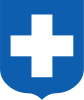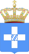 The introduction of the blue shield with the white cross as the heraldic device to represent Greece occurred on 26 February [O.S. 7 January] 1833,[12] when the regency which was governing Greece on behalf of its first king, Otto, announced the official design for the coat of arms. Approved by Prime Minister Josef Ludwig von Armansperg, it detailed the entire heraldic achievement and described, in Greek and German, its constituent parts. The lesser arms are described as an "equidistant azure escutcheon, pointed towards the middle of its lower side, and containing the Greek cross, argent, bearing at its centre a smaller escutcheon with the lozenges of the Royal House of Bavaria."[12] The shade of blue is specified as light blue (German: hellblau).[12] The escutcheon itself was supported by two crowned lions rampant and surmounted by the royal crown.[12] The entire composition was contained within a mantle and pavilion, purple[13] on the outside and ermine on the inside, topped again with the royal crown.[12] This emblem was discarded following the 23 October 1862 Revolution and Otto's subsequent exile. Despite this fact, however, the blue shield with the white cross remained the basis upon which all subsequent coats of arms were based, including the current arms of the Third Hellenic Republic. The white and blue cockade of the revolutionary period was reinstated in March 1833, this time blue on the outside and white on the inside, so that the blue centre was equal to two thirds of the diameter of the cockade.[14] This design, described both as a "national emblem" (ἐθνόσημον) and a "cockade" (κοκάρδα) in Greek and as the "national cockade" (National-Kokarde) in German, was to be worn on caps by uniformed military and civilian personnel as well as on the hats of private citizens that wished to display their national pride.[14]