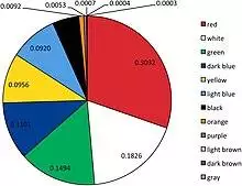 The most popular colours in national flags are red, white, green, dark blue, yellow, light blue, and black.[4] The only national flag not to include the colors red, white, or blue is Jamaica.[5] The occurrence of each colour in all the flags is listed in detail in the table below.[4] The table shows that the colours light brown, dark brown and grey only occur in very small quantities. In fact, they only occur in the symbols on flags, such as in the Spanish flag.