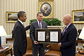 Barack Obama and James R. Clapper presented the National Intelligence Distinguished Service Medal to James L. Jones. (October 20, 2010)