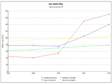 - Average daily gasoline consumption stood at 73 million litres (19,000,000 US gallons; 16,000,000 imperial gallons) in 2006 but fell to 64 million litres (17,000,000 US gallons; 14,000,000 imperial gallons) per day in 2007 concurrent with gasoline rationing plan and to 61 million litres (16,000,000 US gallons; 13,000,000 imperial gallons) after the full implementation of the first phase of the subsidy reforms plan.[12] Gasoline production would reach 70 million litres (18,000,000 US gallons; 15,000,000 imperial gallons) per day in 2013.[12]