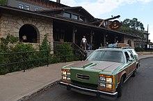 The Wagon Queen Family Truckster station wagon was created specifically for the film. It is based on a 1979 Ford LTD Country Squire station wagon.[12] The car was designed by George Barris, and it lampooned American cars of the late 1970s. The Truckster features a pale avocado metallic green paint scheme, extensive imitation wood-paneling decals, eight headlights (the second pair was taken from another Crown Victoria/Country Squire and mounted upside-down above the stock pair), a grille area largely covered by bodywork with only two small openings close to the bumper, an oddly-placed fuel filler door and an airbag made from a trashcan liner.[13]