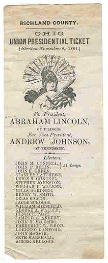 The National Union Party was the temporary name used by the Republican Party and elements of other parties for the national ticket in the 1864 presidential election that was held during the Civil War. For the most part, state Republican parties did not change their name.[1] The temporary name was used to attract War Democrats and border states, Unconditional Unionists and Unionist Party members who would not vote for the Republican Party. The party nominated incumbent Republican President Abraham Lincoln and for Vice President Democrat Andrew Johnson, who were elected in an electoral landslide.
