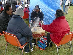 Within various Native American communities, gender plays an important role in music. Men and women play sex-specific roles in many musical activities. Instruments, songs and dances are often peculiar to one or the other sex, and many musical settings are strictly controlled by sex. In modern powwows, women play a vital role as backup singers and dancers.[8] The Cherokee people, for example, hold dances before stickball games. At these pre-game events, men and women perform separate dances and follow separate regulations. Men will dance in a circle around a fire, while women dance in place. Men sing their own songs, while women have their songs sung for them by an elder. Whereas the men's songs invoke power, the women's songs draw power away from the opposing stickball team.[9] In some societies, there are customs where certain ceremonial drums are to be played by men only. For the Southern Plains Indians, it is believed that the first drum was given to a woman by the Great Spirit, who instructed her to share it with all women of native nations. However, there also exist prohibitions against women sitting at the Beg Drum.[9]