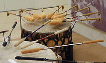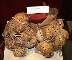 Music and history are tightly interwoven in Native American life. A tribe's history is constantly told and retold through music, which keeps alive an oral narrative of history. These historical narratives vary widely from tribe to tribe and are an integral part of tribal identity. However, their historical authenticity cannot be verified; aside from supposition and some archaeological evidence, the earliest documentation of Native American music came with the arrival of European explorers.[10] Musical instruments and pictographs depicting music and dance have been dated as far back as the 7th century.[11] However, archaeological evidence shows that musical instruments in North America date to at least the Archaic period (ca. 8000–1000 BC), which includes instruments such as turtle shell rattles.[12][13]