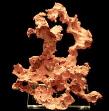 Native silver occurs as elongated dendritic coatings or irregular masses. It may also occur as cubic, octahedral, or dodecahedral crystals. It may occur alloyed with gold as electrum. It often occurs with silver sulfide and sulfosalt minerals.[4][5] Various amalgams of silver and mercury or other metals and mercury do occur rarely as minerals in nature. An example is the mineral eugenite (Ag11Hg2) and related forms.[6] Silver nuggets, wires, and grains are relatively common, but there are also a large number of silver compound minerals owing to silver being more reactive than gold.