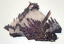 All other native metals occur only in small quantities or are found in geologically special regions. For example, metallic cadmium was only found at two locations including the Vilyuy River basin in Siberia.[14] Native molybdenum has been found in lunar regolith and in the Koryakskii volcano in Kamchatka Oblast of Russia.[15] Elsewhere in this region native indium, aluminium, tantalum, selenium, tellurium, and other metals have been reported. Native lead[16] is quite rare but somewhat more widespread, as are tin,[17] mercury,[18] arsenic,[19] antimony,[20] and bismuth.[21]