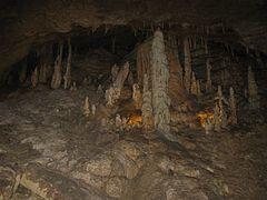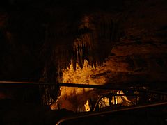 The Natural Bridge Caverns are the largest known commercial caverns in the U.S. state of Texas. The name[1] is derived from the 60 ft natural limestone slab bridge that spans the amphitheater setting of the cavern's entrance. The span was left suspended when a sinkhole collapsed below it.