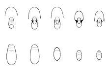 The "tentacles" of the nautiluses are actually cirri (singular: cirrus), composed of long, soft, flexible appendages which are retractable into corresponding hardened sheaths. Unlike the 8–10 head appendages of coleoid cephalopods, nautiluses have many cirri. In the early embryonic stages of nautilus development a single molluscan foot differentiates into a total of 60–90 cirri, varying even within a species.[6] Nautilus cirri also differ from the tentacles of some coleoids in that they are non-elastic and lack pads or suckers. Instead, nautilus cirri adhere to prey by means of their ridged surface. Nautiluses have a powerful grip, and attempts to take an object already grasped by a nautilus may tear away the animal's cirri, which will remain firmly attached to the surface of the object. The main cirri emerge from sheaths which cohere into a single firm fleshy mass. Also, the pair of cirri before the eye (pre-ocular) and the pair of cirri behind the eye (post-ocular) are separate from the others. These are more evidently grooved, with more pronounced ridges. They are extensively ciliated and are believed to serve an olfactory purpose.[7][8][9]
