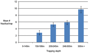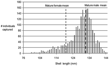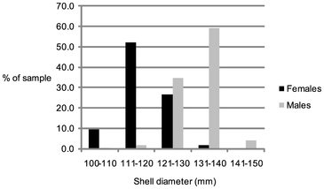 Right: Shell diameter of mature male and female N. pompilius caught at Osprey Reef. Males (n = 870) had a mean shell diameter of 131.9±2.6 mm, compared to 118.9±7.5 mm in females (n = 86). The Osprey Reef N. pompilius population is the second smallest known in terms of mean shell diameter, after the dwarf form from the Sulu Sea (130.7 mm and 115.6 mm, respectively).[15]
