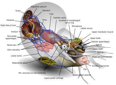 The mouth consists of a parrot-like beak made up of two interlocking jaws capable of ripping the animal's food— mostly crustaceans— from the rocks to which they are attached.[10]:p. 105 Males can be superficially differentiated from females by examining the arrangement of tentacles around the buccal cone: males have a spadix organ (shaped like a spike or shovel) located on the left side of the cone making the cone look irregular, whereas the buccal cone of the female is bilaterally symmetrical.[10]:pp. 115–130