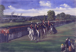 General Joseph Smith commanding the Nauvoo Legion infantrymen in formation between 1839 and 1844 in Nauvoo, Illinois, with the Nauvoo Temple on a hill in the background | |