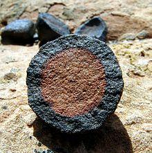 The abundant concretions found in the Navajo Sandstone consist of sandstone cemented together by hematite (Fe2O3), and goethite (FeOOH). The iron forming these concretions came from the breakdown of iron-bearing silicate minerals by weathering to form iron oxide coatings on other grains. During later diagenesis of the Navajo Sandstone while deeply buried, reducing fluids, likely hydrocarbons, dissolved these coatings. When the reducing fluids containing dissolved iron mixed with oxidizing groundwater, they and the dissolved iron were oxidized. This caused the iron to precipitate out as hematite and goethite to form the innumerable concretions found in the Navajo Sandstone. Evidence suggests that microbial metabolism may have contributed to the formation of some of these concretions.[17] These concretions are regarded as terrestrial analogues of the hematite spherules, called alternately Martian "blueberries" or more technically Martian spherules, which the Opportunity rover found at Meridiani Planum on Mars.[4][5]