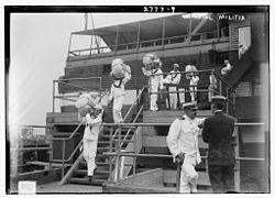 The naval militias were called into service during the Spanish–American War. Since no law existed to call them into federal service as a unit, governors were asked to release volunteers from their state service, and these naval militiamen were inducted into the Navy for the duration of their service during the war.[6] New York Naval Militiamen manned two auxiliary cruisers that fought in the Battle of Santiago de Cuba, and conducted patrols of New York Harbor.[5] Members of the North Carolina Naval Militia crewed USS Nantucket and guarded the city of Port Royal, South Carolina.[7] South Carolina Naval Militia sailors also assisted in the defense of Port Royal, and served aboard multiple ships, including USS Celtic, USS Chickasaw, USS Cheyenne, and USS Waban.[8] Members of the Connecticut Naval Militia served aboard USS Minnesota.[9] Sailors from both the Rhode Island Naval Militia[10] and the Florida Naval Militia[11] were also assimilated into the ranks of the Navy.