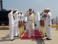 President Jimmy Carter salutes the sideboys after departing the USS Jimmy Carter (SSN-23)