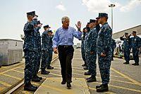 Secretary of Defense Chuck Hagel greets sailors at Kings Bay.
