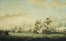 Throughout the wars, which lasted, with a brief interval of peace, from 1793 to 1815, British admirals like Jervis, Duncan and particularly Nelson grew constantly bolder in the method they adopted for producing the desired mêlée or pell-mell action at the battles of Cape St. Vincent, Camperdown and Trafalgar.[7] The most radical tactic was the head-on approach in column used by Nelson at Trafalgar, which invited a raking fire to which his own ships could not reply as they approached, but then produced a devastating raking fire as the British ships passed through the Franco-Spanish line.