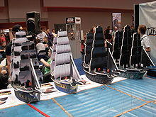 Land-based miniature wargames have also been adapted to naval wargaming. All at Sea, for example, is an adaptation of The Lord of the Rings Strategy Battle Game rules for naval conflicts. The game's mechanics centred on boarding parties, with options for ramming actions and light artillery in the form of ballistae and other siege engines.[7] As such, the ship's scale ratio corresponds to the 25 mm scale miniatures used by The Lord of the Rings. Model ships are built by hobbyists, just as normal miniature terrain, such as "great ships" of Pelargir, cogs of Dol Amroth and Corsairs of Umbar galleys.[8] Elsewhere successful adaptations of the DBA and Fire and Fury land warfare rules have been made to ancient and Renaissance naval battles at the fleet action level (where naval battles shared many characteristics of their land based equivalents).