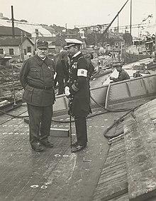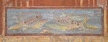 First attested in English in the early 14th century,[1] the word "navy" came via Old French navie, "fleet of ships", from the Latin navigium, "a vessel, a ship, bark, boat",[2] from navis, "ship".[3] The word "naval" came from Latin navalis, "pertaining to ship";[4] cf. Greek ναῦς (naus), "ship",[5] ναύτης (nautes), "seaman, sailor".[6] The earliest attested form of the word is in the Mycenaean Greek compound word , na-u-do-mo (*naudomoi), "shipbuilders", written in Linear B syllabic script.[n 1]