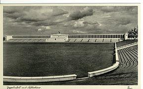 In the north-east of the rally grounds the KdF-Stadt (KdF-City) was built. In wooden exhibition halls regional products were presented and recreational events were accomplished during the party congresses. The NS-organisation KdF looked after workers during their free time.