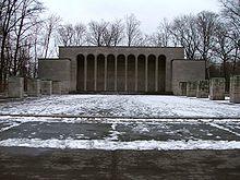 The "Ehrenhalle" was built by the City of Nuremberg according to a plan of German architect Fritz Mayer. It was inaugurated in 1930, before the Hitler era during the Weimar Republic.[5] It is an arcaded hall with an adjacent cobbled stone terrace with two rows of pedestals for fire bowls. All fourteen pylons remain virtually intact and have not been ignited since the final Nazi party rally in September 1938. Originally the hall was to be a memorial site for the 9,855 soldiers from Nuremberg who had fallen in World War I.