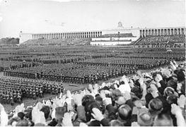 On 30 August 1933 Hitler declared Nuremberg the "City of the Reichsparteitage (Reich Party Congresses)".[2] The Party Congresses (Reichsparteitage) were a self-portrayal of the NS-state and had no programmatic task, simply demonstrating the unity of the nation. In a propagandistic way a relation was to be drawn between the NS movement and the glory of the medieval emperors and the meetings of the Imperial States which were held in Nuremberg.[3]