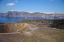 Nea Kameni is a small uninhabited Greek island of volcanic origin located in the Aegean Sea, within the flooded Santorini caldera. Nea Kameni and the neighbouring small island Palea Kameni (the new and old burnt islands) have formed over the past two millennia through repeated eruptions of dacite lava and ash. The Roman historian Cassius Dio records in the year 47 CE "This year a small islet, hitherto unknown, made an appearance close to the island of Thera."[2] Cassius' report may refer to Palaia Kameni. Pliny the Elder reports a new island emerging during on July 8, in the year of the consulship of M. Junius Silanus and L. Balbus, thus 19 CE.[3]
