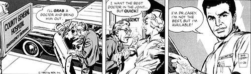 In 1962, Adams began his comics career in earnest at the Newspaper Enterprise Association syndicate. From a recommendation, writer Jerry Caplin, a.k.a. Jerry Capp, brother of Li'l Abner creator Al Capp, invited Adams to draw samples for Capp's proposed Ben Casey comic strip, based on the popular television medical-drama series.[8] On the strength of his samples and of his "Chip Martin, College Reporter" AT&T advertising comic-strip pages in Boys' Life magazine, and of his similar Goodyear Tire ads,[11] Adams landed the assignment.[8] The first daily strip, which carried Adams' signature, appeared November 26, 1962; a color Sunday strip was added September 20, 1964.[12] Adams continued to do Johnston & Cushing assignments during Ben Casey's 3 1&fras1;2-year run.[13]