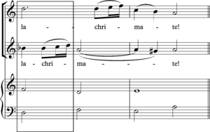 In his oratorio Jephte, Giacomo Carissimi portrays the grief-stricken tears ("lachrimate") of Jephtha’s daughter and her companions at the prospect of her brutal fate. According to Richard Taruskin, "The daughter’s lament… makes especially affective use of the ‘Phrygian’ lowered second degree at cadences, producing what would later be called the Neapolitan (or ‘Neapolitan sixth) harmony."[8] (B♭ in the key of A minor).