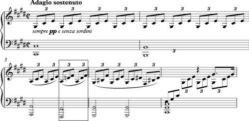 Ludwig van Beethoven used the Neapolitan chord frequently in some of his best-known works, including the opening of his Moonlight Sonata, Op. 27 No. 2: