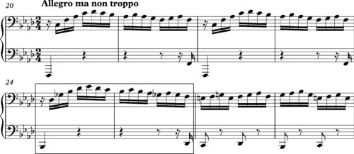 Beethoven’s Appassionata Sonata, Op. 57 uses the Neapolitan chord on a broader harmonic canvas. Both the first and last movements of the sonata open with a phrase repeated a semitone higher (G♭ in the key of F minor).[16]