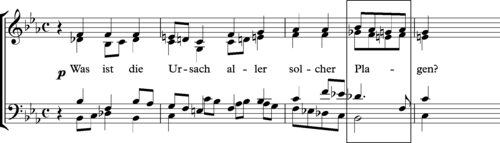 In J.S. Bach’s St Matthew Passion, No. 19, the episode conveying Christ’s agony in the garden of Gethsemane, the Neapolitan chord (G♭ in the key of F minor) is used on the word "Plagen" (torments) in the chorale harmonization sung by the chorus: