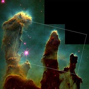 Diffuse emission nebula, or H II region, cataloged as M16. The Eagle Nebula, so named from its supposed resemblance to the iconic raptor (frontal view, wings spread, head bowed), is the location of one of the Hubble Space Telescope's most popular images, the Pillars of Creation (see graphic below), which often appear in science fiction film and television. The picture was released by NASA in 1995; within two years (1997) it had already found use in a number of works.