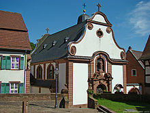 - The Catholic Herz-Jesu-Kirche (“Jesus’s Heart Church”) was built in Neo-Baroque style between 1906 and 1908 by Prof. Friedrich Pützer. The main altar from 1750 shows Saint Stephen in the middle and came originally from Saint Stephen's Church (Catholic) in Mainz-Gonsenheim. The side altars were originally in the church now used as an Evangelical church, but formerly as an interdenominational church before the Catholic Church was built, and date from 1711.