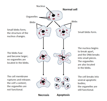 The first of these two pathways initially involves oncosis, where swelling of the cells occurs.[15] Affected cells then proceed to blebbing, and this is followed by pyknosis, in which nuclear shrinkage transpires.[15] In the final step of this pathway cell nuclei are dissolved into the cytoplasm, which is referred to as karyolysis.[15]