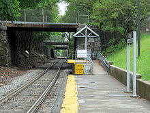 The Needham Cutoff opened on November 4, 1906 from West Roxbury to Needham Junction, allowing trains from the former New York and New England Railroad to reach Boston without needing to use the Highland Branch.[3] Building the cutoff required a significant length of difficult rock cuts - "one of the heaviest pieces of short railroad construction ever attempted in New England" - reaching a depth of 57 feet (17 m) at Great Plain Avenue.[7] Originally Needham Junction was the only stop on the cutoff; Bird's Hill opened as an infill station in 1917.[3]