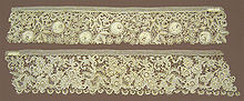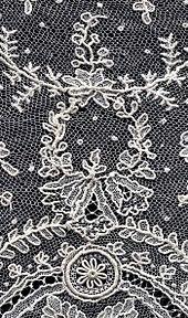 In its purest form, the only equipment and materials used are a needle, thread and scissors. The origins of needle lace date back to the 16th century in Italy, and its origins may be found in the openwork on linen technique called reticella.[1] A variety of styles developed where the work is started by securing heavier guiding threads onto a stiff background (such as thick paper) with stitches that can later be removed. The work is then built up using a variety of stitches—the most basic being a variety of buttonhole or blanket stitch. When the entire area is covered with the stitching, the stay-stitches are released and the lace comes away from the paper.