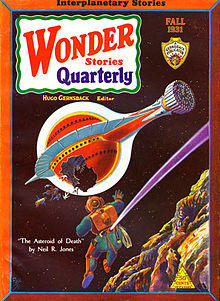 Rating not even a cover mention, the first installment of Jones' most popular creation, "The Jameson Satellite", appeared in the July 1931 issue of Amazing Stories.[1] The hero was Professor Jameson, the last Earthman, who became immortal through the science of the Zoromes. Jameson was obsessed with the idea of perfectly preserving his body after death and succeeded by having it launched into space in a small capsule. Jameson's body survived for 40,000,000 years, where it was found orbiting a dead planet Earth by a passing Zorome exploration ship. The Zoromes, or machine men as they sometimes called themselves, were cyborgs. They came from a race of biological beings who had achieved immortality by transferring their brains to machine bodies. They occasionally assisted members of other races with this transition (e.g. the Tri-Peds and the Mumes), allowing others to become Zoromes and join them on their expeditions, which sometimes lasted hundreds of years. So, much like the Borg of the Star Trek series, a Zorome crew could be made up of assimilated members of many different biological species. The Zoromes discovered that Jameson's body had been so well preserved that they were able to repair his brain, incorporate it into a Zorome machine body and restart it. The professor joined their crew and, over the course of the series, participated in many adventures, even visiting Zor, the Zorome homeworld, where he met biological Zoromes. The professor eventually rose to command his own crew of machine men on a new Zorome exploration ship. "The Jameson Satellite" proved so popular with readers that later installments in Amazing Stories got not only cover mentions but the cover artwork. The series eventually became some of the most popular and well-known of the 1930s pulps.[2]