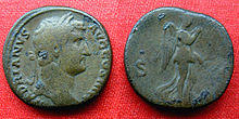 Nemesis was one of several tutelary deities of the drill-ground (as Nemesis campestris). Modern scholarship offers little support for the once-prevalent notion that arena personnel such as gladiators, venatores and bestiarii were personally or professionally dedicated to her cult. Rather, she seems to have represented a kind of "Imperial Fortuna" who dispensed Imperial retribution on the one hand, and Imperially subsidized gifts on the other; both were functions of the popular gladiatorial Ludi held in Roman arenas.[10] She is shown on a few examples of Imperial coinage as Nemesis-Pax, mainly under Claudius and Hadrian. In the third century AD, there is evidence of the belief in an all-powerful Nemesis-Fortuna. She was worshipped by a society called Hadrian's freedmen.