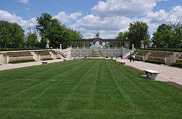 The estate has the most developed and largest jardin à la française (French formal garden)-style landscape park and collection of individual gardens in North America. The design is patterned after the gardens of Versailles surrounding the Petit Trianon at the Château de Versailles. Their central axis extends ⅓ of a mile from the mansion facade, paralleling the main avenue leading to the house. The grounds are beautifully landscaped with plantings, fountains, pools, a carillon tower, statuary, and a pavilion surrounded by naturalized woodlands.[2][5][6]