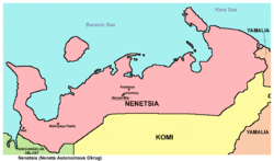 Ethnographic maps shows the Nenets living throughout the Okrug, with the east-central section of the okrug, along the Komi Republic border, showing mixed Nenets-Komi population.[29]