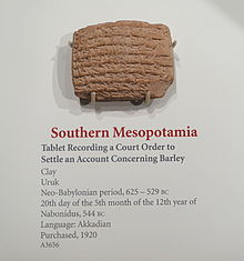 The most detailed economical records from Neo-Babylonian times are from these temples. The people who cultivated the temple lands of Babylonia were mostly unfree personnel, so-called temple dependents (širāku[64]), which were usually given larger work assignments than they could accomplish. In later times, to increase productivity, the temples began hiring "rent farmers". These rent farmers were given a portion or all of a temple's farming grounds and fields, including the temple dependents and equipment there, in exchange for money and a fixed quota of commodities to supply to the temple.[63] Rent farmers were personally liable for accidents and falling short of the quota and there are many records of rent farmers giving up or sometimes being required to sell their own possessions and assets to the temple as compensation.[65]