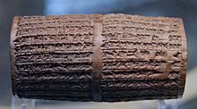 The troops of the Neo-Babylonian Empire would have been supplied by all parts of its complex administrative structure – from the various cities of Babylonia, from the provinces in Syria and Assyria, from the tribal confederations under Babylonian rule and from the various client kingdoms and city-states in the Levant.[73] The most detailed sources preserved from the Neo-Babylonian period concerning the army are from the temples, which supplied a portion of the temple dependents (called širāku) as soldiers in times of war. These dependents were mostly farmers (ikkaru) but some were also shepherds, gardeners and craftsmen. The vast majority of these levies from the temples seved in the army as archers, equipped with bows, arrows (each archer was supplied with 40–60 arrows), bow-cases and daggers. The bows, made in both distinct Akkadian and Cimmerian styles, were manufactured and repaired at the temples by trained bowmakers and arrows and daggers were made by temple smiths.[64] Inscriptions from the Ebabbara temple in Sippar suggests that temples could field as many as 14% of their dependents in times of crisis (for the Ebabbara this would account for 180 soldiers), but that the number was usually much lower (with the most common number of soldiers supplied by the Ebabbara being 50 soldiers). The archers fielded by these temples were divided into contingents or decuries (ešertu) by profession, each led by a commander (rab eširti). These commanders were in turn under the command of the rab qašti, who answered to the qīpu (a local high official). Cavalry and chariots were also supplied by the temples, but there are few known inscriptions detailing their equipment, relative number or leadership structure.[76]