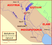 In 549 BC Cyrus the Great, the Achaemenid king of Persia, revolted against his suzerain Astyages, king of Media, at Ecbatana. Astyages' army betrayed him and Cyrus established himself as ruler of all the Iranic peoples, as well as the pre-Iranian Elamites and Gutians, ending the Median Empire and establishing the Achaemenid Empire. Ten years after his victory against the Medes, Cyrus invaded Babylon. Nabonidus sent his son Belshazzar to head off the huge Persian army but the Babylonian forces were overwhelmed at the Battle of Opis. Nabonidus fled to Borsippa, and on 12 October, after Cyrus' engineers had diverted the waters of the Euphrates, the soldiers of Cyrus entered Babylon without the need for a battle. Nabonidus surrendered and was deported. Gutian guards were placed at the gates of the great temple of Marduk, where the services continued without interruption.[28]