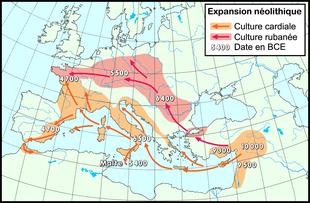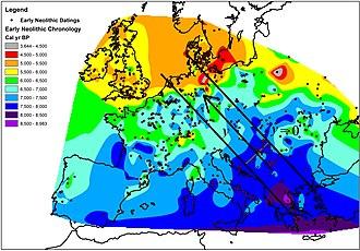 The spread of the Neolithic from the Near East Neolithic to Europe was first studied quantitatively in the 1970s, when a sufficient number of 14C age determinations for early Neolithic sites had become available.[2] Ammerman and Cavalli-Sforza discovered a linear relationship between the age of an Early Neolithic site and its distance from the conventional source in the Near East (Jericho), thus demonstrating that the Neolithic spread at an average speed of about 1 km/yr.[2] More recent studies confirm these results and yield the speed of 0.6–1.3 km/yr at 95% confidence level.[2]