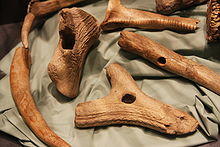 Most clothing appears to have been made of animal skins, as indicated by finds of large numbers of bone and antler pins that are ideal for fastening leather. Wool cloth and linen might have become available during the later Neolithic,[72][73] as suggested by finds of perforated stones that (depending on size) may have served as spindle whorls or loom weights.[74][75][76] The clothing worn in the Neolithic Age might be similar to that worn by Ötzi the Iceman, although he was not Neolithic (since he belonged to the later Copper Age).