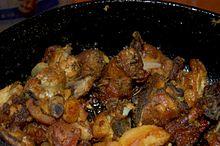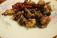 Taro root is an important crop in the region. The leaves and roots are eaten. Sidhara[18] is a mixture of taro root, dried fish and turmeric that is formed into cakes and dried for preservation. The cakes are broken up and cooked with radish, chili, garlic and other spices to accompany boiled rice. Snails are cleansed, boiled and spiced to make ghonghi.[19] Another short compendium of Tharu and Maithil recipes[20] includes roasted crab, wheat flatbread fried in mustard oil, and fried taro leaf cakes.