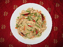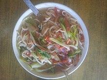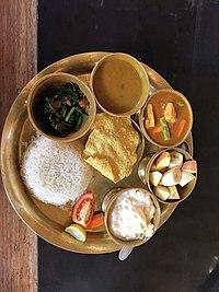 Nepali/Nepalese cuisine comprises a variety of cuisines based upon ethnicity, soil and climate relating to Nepal's cultural diversity and geography. Dal-bhat-tarkari (Nepali: दाल भात तरकारी) is eaten throughout Nepal. Dal is a soup made of lentils and spices, served over boiled grain, bhat—usually rice but sometimes another grain - and a vegetable curry, tarkari. Condiments are usually small amounts of spicy pickle (achaar, अचार) which can be fresh or fermented, (mainly of dried mustard greens called as 'gundruk ko achar' and radish known as 'mula ko achar') and of which there are a considerable number of varieties.[1] Other accompaniments may be sliced lemon (nibuwa) or lime (kagati) with fresh green chilli (hariyo khursani) and a fried papad (thin, crisp disc-shaped food). Dhindo (ढिंडो) is a traditional food of Nepal.
