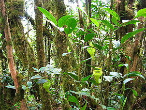 Right: Nepenthes flava growing in mossy forest under a 10 m high canopy at 1850–2000 m